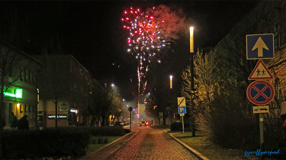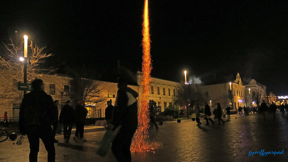 Egy, talán nem igazán szabályos tűzijáték 2018 Újévén a keszthelyi főtéren – ha nem szabályos, fel lehet lépni ellene – Fotó: Győrffy Árpád