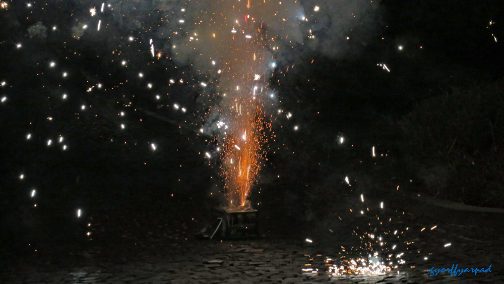 Tűzijáték indítás a keszthelyi Kossuth utcán valahol a Balatoni Múzeum körül. Arra a részre az idén sem vonatkozik a tiltás – Fotó: Győrffy Árpád