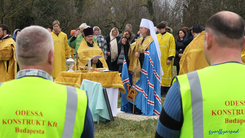 Az ünnepélyes alapkőletétel 2019-ben. Háttal a kivitelezést végző budapesti orosz kötődésű cég dolgozói. Az építkezés elhúzódását a jelenleg felszámolás alatt lévő vállalkozás gondjai is okozhatták – Fotó: Győrffy Árpád