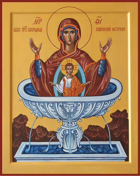 Alekszej Vronszkij ikonfestő megfestette a templom ikonjait. A templomnak nevet adó, az Életadó Forrás ikonja – Forrás: heviz.magyarortodox.com