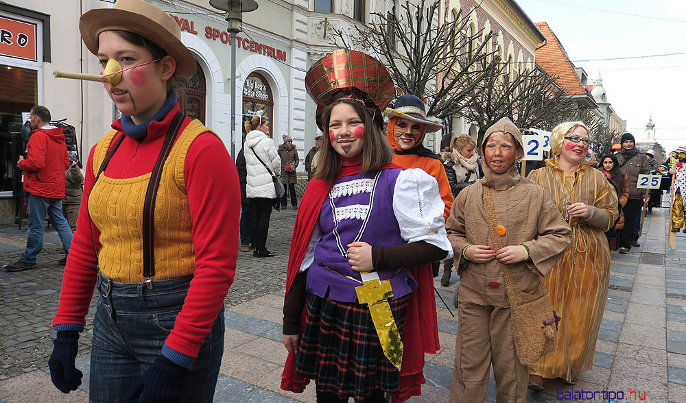 A Több mint kétszáz mese- és mozihősnek, retro munkásembernek bohócnak és más érdekes figurának öltözött gyerek és felnőtt vonult végig a Korzón a Festetics-kastély és a Fő tér között. A menetet az idén is a városi szambazenekar, a Gombos László vezetésével 10 éve együtt játszó Boombatucada vezette. A különböző dombokból és más üthető, rázható hangkeltő eszközökből álló zenekart a karneváli herceg és párja, majd a karnevált rendező Balatoni Borbarát Hölgyek csoportja követte, majd a többiek. A sétálóutcát majdnem teljes hosszában végigérő menetben több óvoda ovisai, iskola diákjai, civil szervezet tagjai és családok, baráti társaságok vonultak.