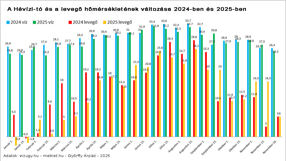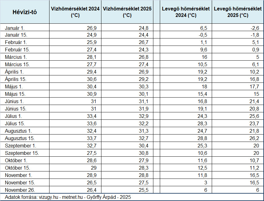 Az összehasonlításhoz mindkét évben minden hónap 1. és 15. napján, délelőtt 10 órakor mért vízhőmérsékleteket, illetve az adott nap napi középhőmérsékletet gyűjtöttem le a 2024. január 1. és a 2025. november 26. közötti időszakban. Mivel a meteorológiai állomás két érintett napon nem szolgáltatott adatot – vélhetően technikai gondok miatt -, ezekre az időpontokra a közelben lévő sármelléki repülőtéren működő állomás méréseit használtam.