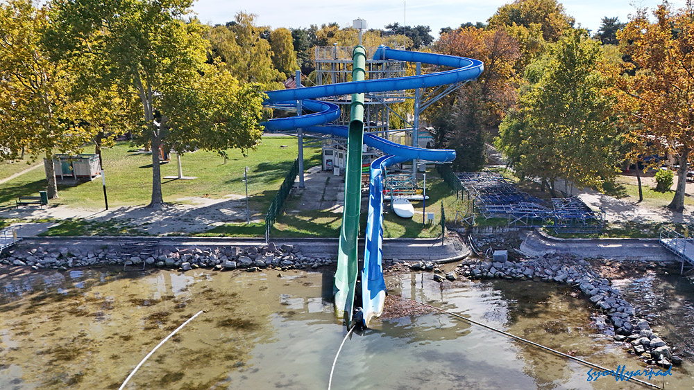 A nem rég felújított csúszda Balatonfenyvesen, ahol a hiányzó víz miatt nincs hova csobbanni – Fotó: Győrffy Árpád