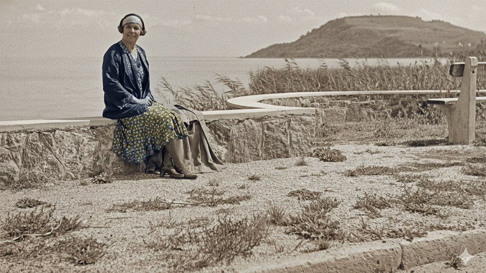 Pihenő nő az egyik rondellánál a füredi határ közelében 1933-ban. A háttérben a Tihanyi-félsziget az Óvár-tetővel – a Google AI Studio színezésével – Fotó: Kieselbach Tamás – Fortepan.hu