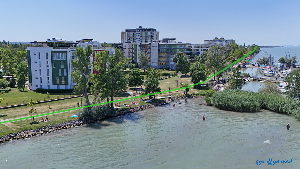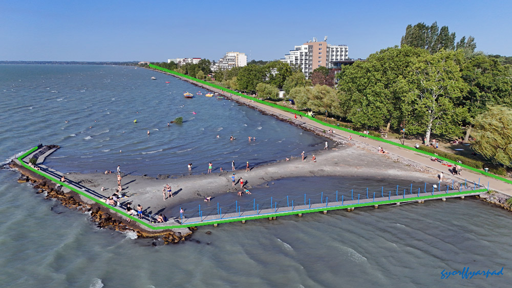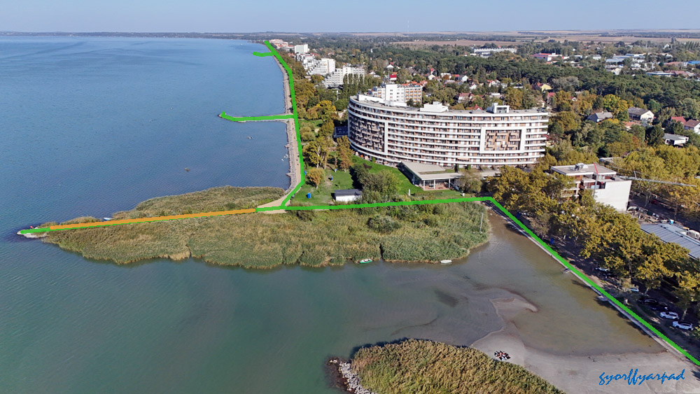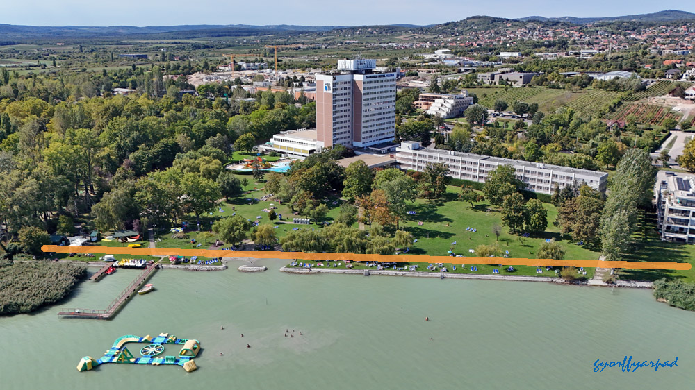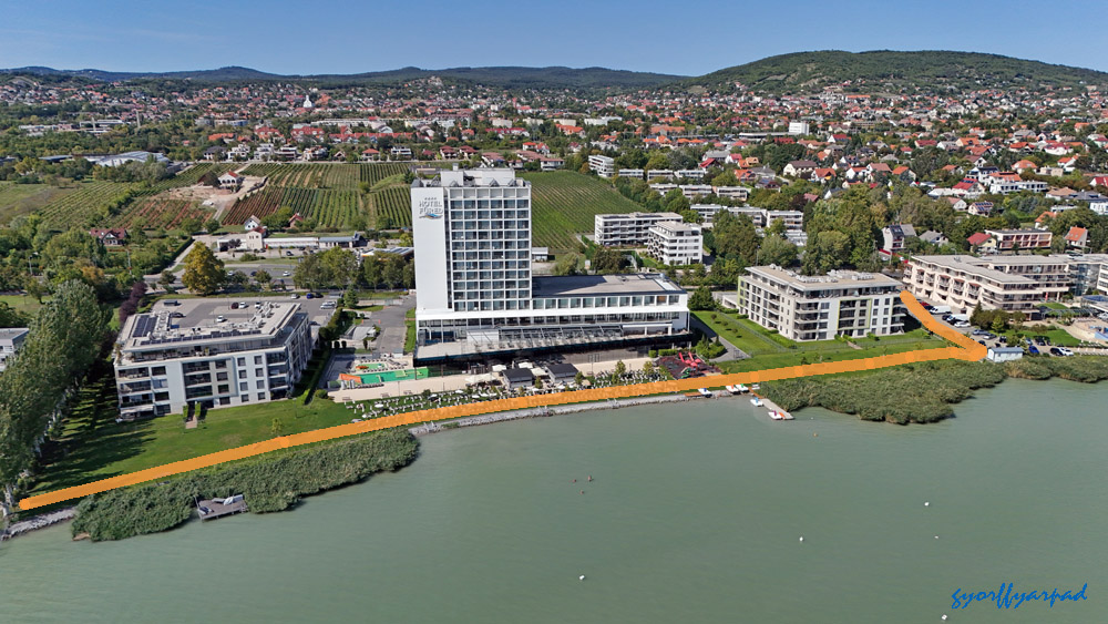 A szállodasor napjainkban. A kormányrendelet szerint a narancssárgával jelölt vonalon nyitott parti sétányt kell kialakítani (valamikor). A kép jobb oldalán a Nagystrand széle látható. Az óriáskerék árnyékával fedett öbölben egy közhasználatú, fürdésre használható zöldterületet terveztek a rendeletben – Fotó: Győrffy Árpád