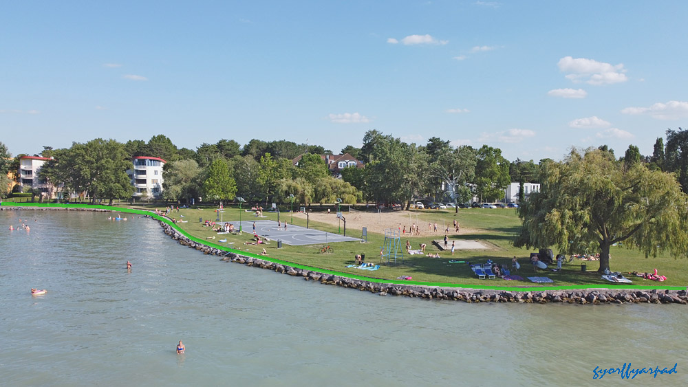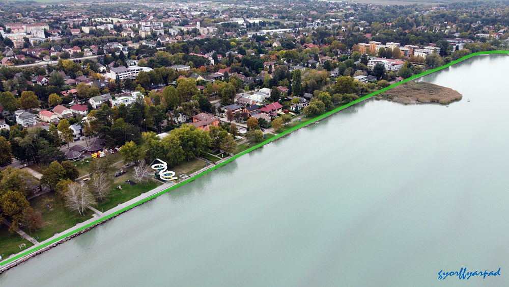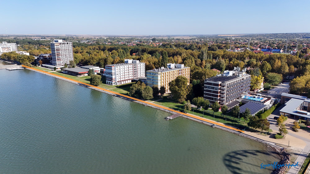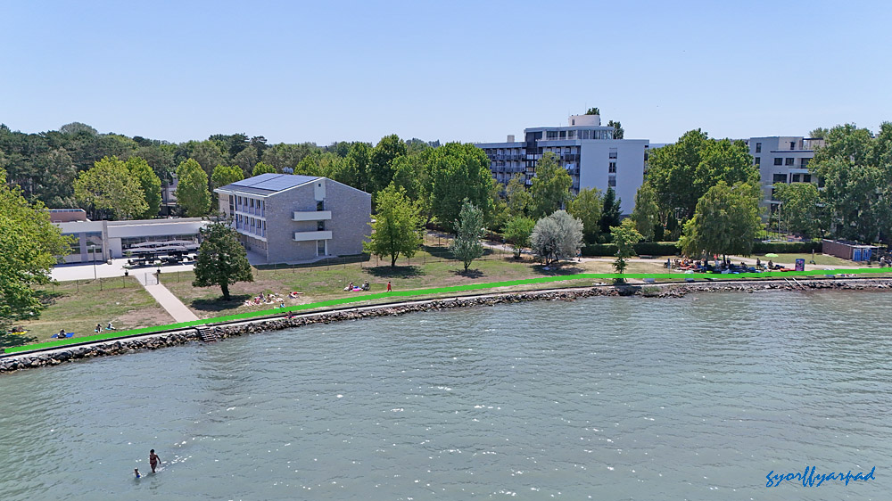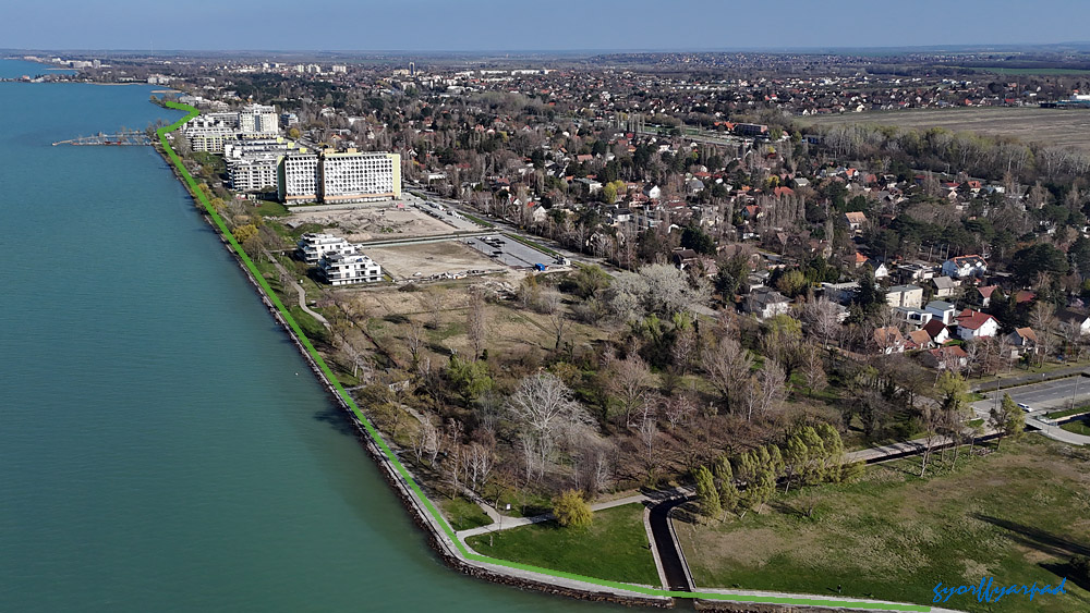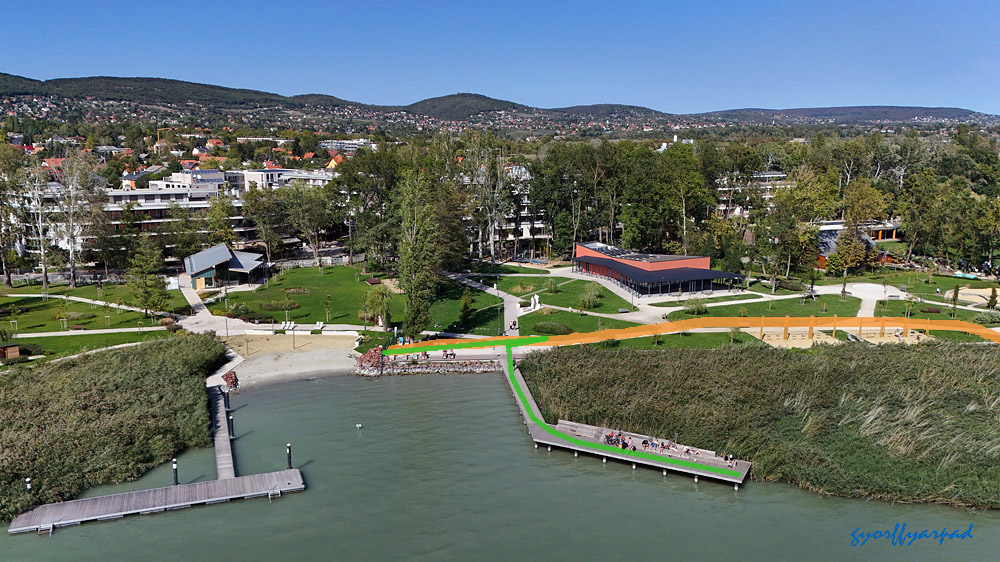 A szállodasor napjainkban. A kormányrendelet szerint a narancssárgával jelölt vonalon nyitott parti sétányt kell kialakítani (valamikor). A kép jobb oldalán a Nagystrand széle látható. Az óriáskerék árnyékával fedett öbölben egy közhasználatú, fürdésre használható zöldterületet terveztek a rendeletben – Fotó: Győrffy Árpád