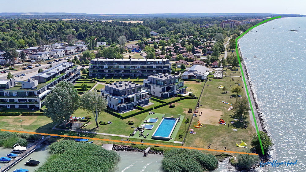 Ugyanezt a területet láthatjuk a fotón is. A narancssárga vonallal jelzett partszakasz elvileg parti sétány. Ez vonatkozik a narancssárga vonal jobb oldali ötödénél lévő, külön lekerített LUA Beach-re, a LUA “Felnőtt” Hotel strandjaként, rendezvény területeként használt részre is. A kép jobb oldalán zölddel a Kékszalag Port vitorláskikötő területén kijelölt és használható parti sétányt jelöltem – Fotó: Győrffy Árpád