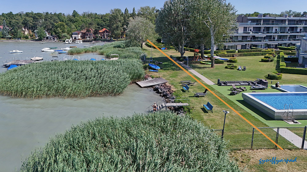 Balról a 800 milliós támogatással megépített, “intim luxust” biztosító Aranyhíd strand, ami az eredeti vállalás szerint tavaly nyílt volna meg, de úgy tűnik erre még egy évet várni kell. Jobbról a tőle kerítéssel elválasztott Brázay park, ami egész évben látogatható. Narancssárgával a parti sétánynak a nádas takarásában lévő részét jelöltem, zölddel a nyitottat. Bár a Brázay panoráma stégje nem szerepel a rendeletben kijelölt sétányként, azt is beszámítottam a füredi valós lehetőségek közé – Fotó: Győrffy Árpád