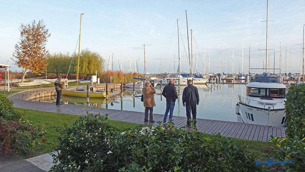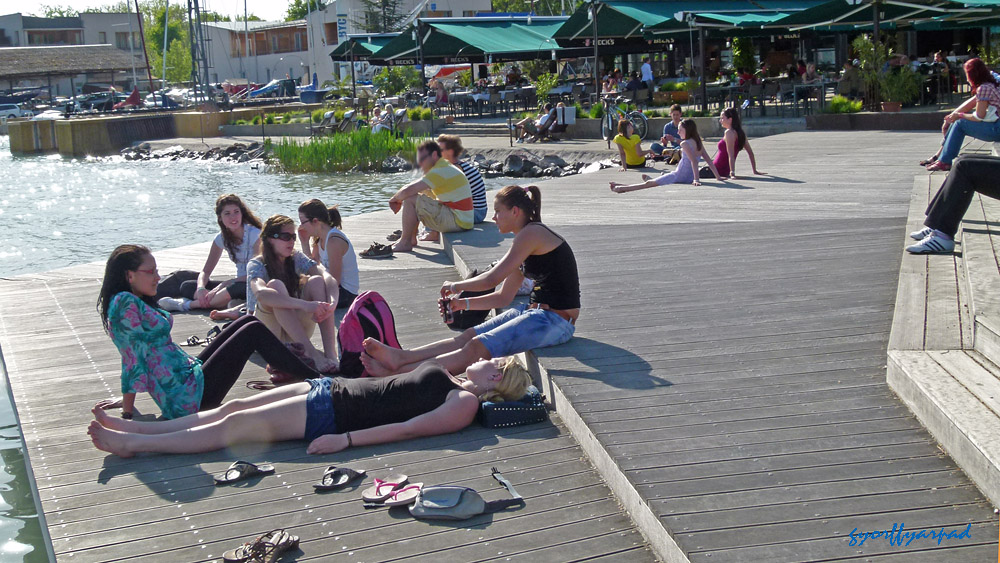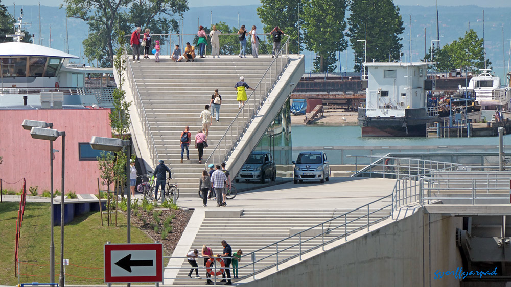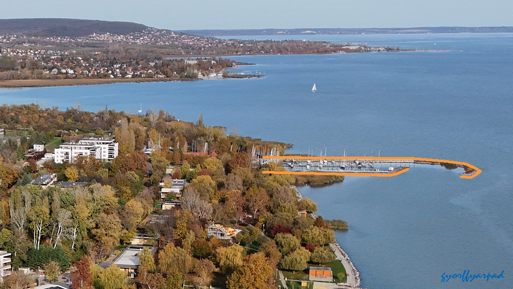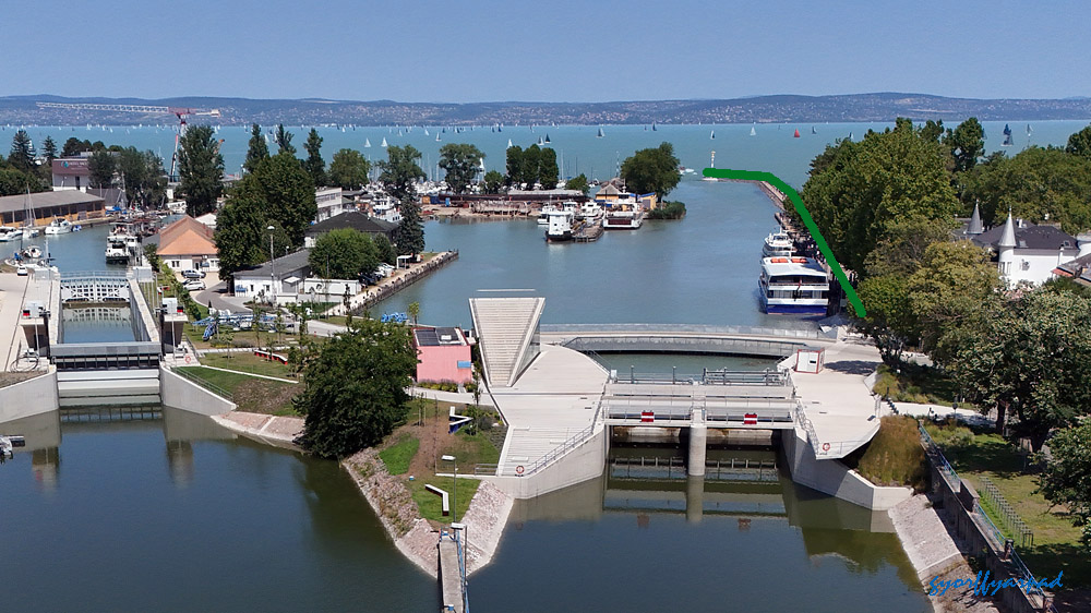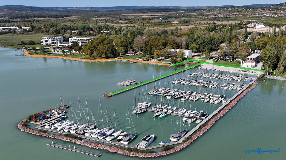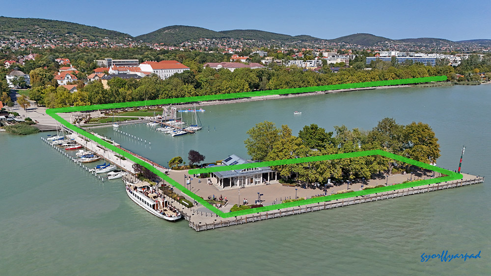 A kép jobb oldalán a mólón és a hajóállomás területén kijelölt vízparti sétány. A hozzánk közelebb eső végénél kezdődik a Sió-csatorna közelmúltban felújított vízeresztő zsilipje. Ennek területe nem szerepel kijelölt sétányként, de tavasztól-őszig szabadon bejárható – Fotó: Győrffy Árpád