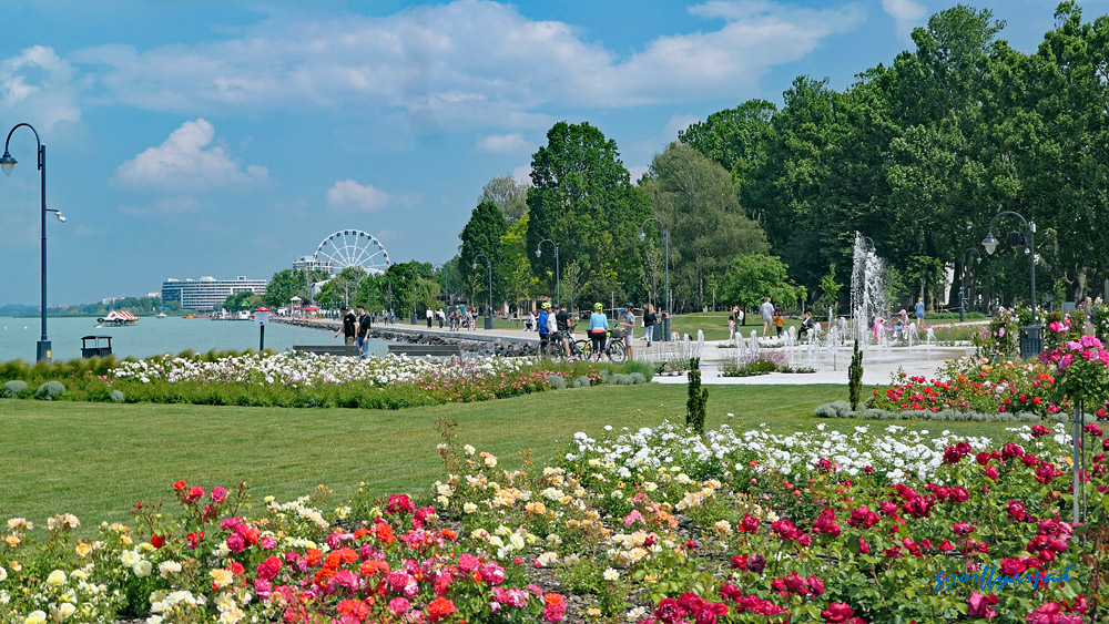A Rózsakert részlete a sétánnyal egy tavaly májusi képen. A háttérben a Nagystrand az óriáskerékkel és az Aranypart elejénél álló Club 218 épülete – Fotó: Győrffy Árpád