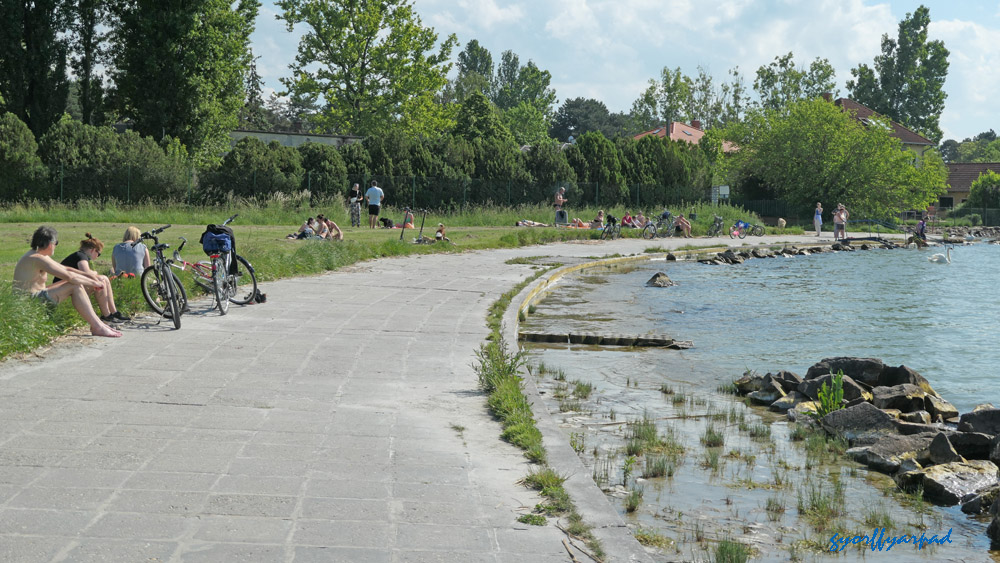Az Aranypart keleti felén a víztől kicsit távolabb építették a kövezett sétányt, így a sétálók és strandolók nem zavarják egymást. A város központjához közelebbi részen korábban kiépített sétány még közvetlenül a part mellé került – Fotó: Győrffy Árpád