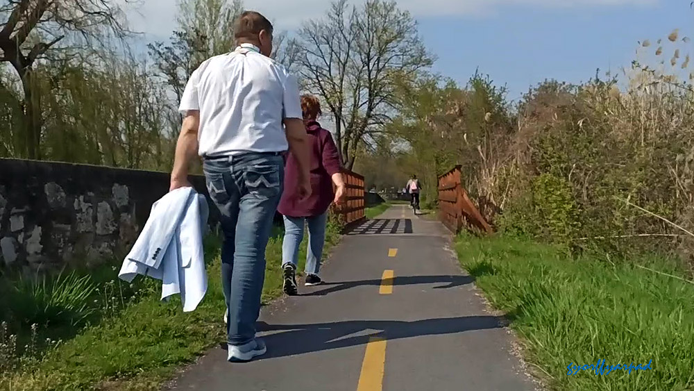 Sétálók a sétányként és kilátóként is használható zsilipen. (Az autó valami munka miatt lehet a területen. A zsilipre egyébként csak gyalogosan lehet bemenni, még a biciklit is kint kell letámasztani. – Fotó: Győrffy Árpád