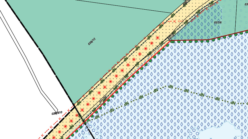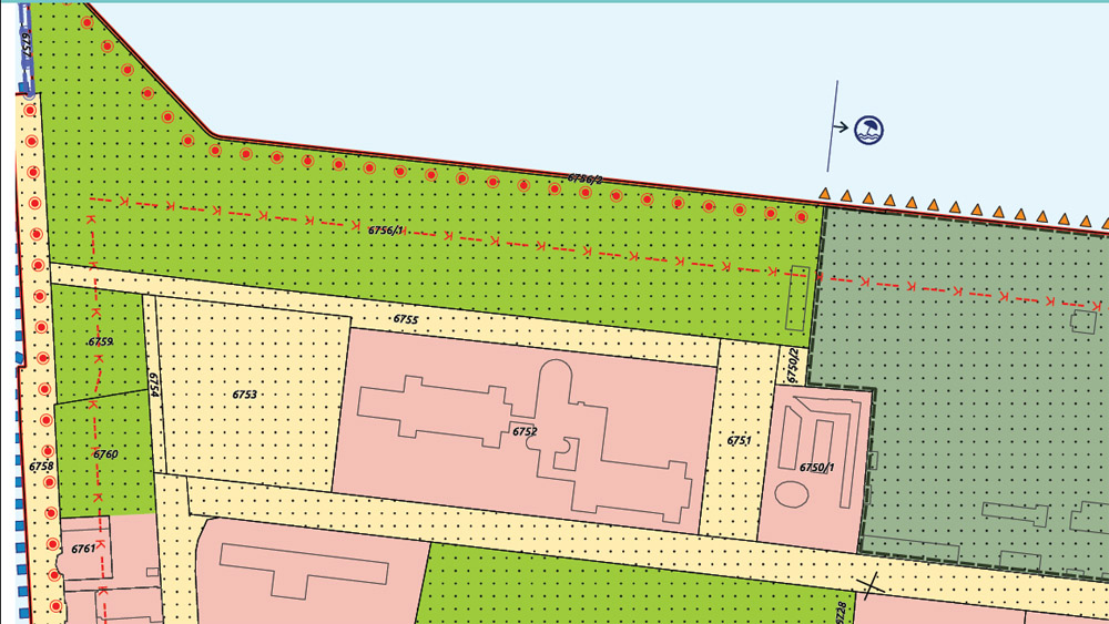 A jogszabályhoz kapcsolt térképen a kemping megmaradt részének parti sávja látható a kikötőnek lehasított résszel. A pontozás azt jelzi, hogy az érintett részt “közhasználatú területként” sorolták be. A piros karikában lévő piros pöttyök pedig a parti sétány nyomvonalát mutatják – Forrás: 287/2025 kormányrendelet