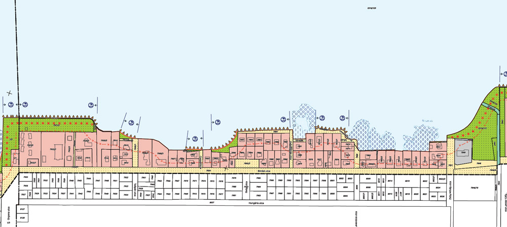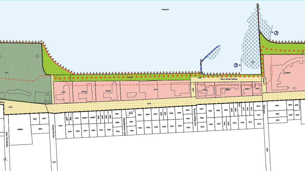 A képen az Aranypart északkeleti vége. Ahogy a képen is látszik, illetve nem látszik, a nyitott parti sétányt jelölő zöld vonal a végtelenben tart. A “szállodasornál” (Táncsics utca) lévő túlsó vége innen 4,2 kilométerre van. Ahogy itt is látható, a parttól számított 30 méteres sáv mindenkié, bárki használhatja. (A narancssárgával jelzett részről majd később.) – Fotó: Győrffy Árpád