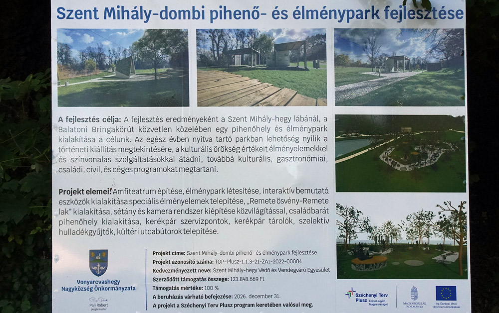A Szent Mihály-dombra vezető ösvény mellett tábla hirdeti, hogy 124 millió forintos támogatásból egy “pihenő- és élménypark fejlesztése” zajlik a domb alatti területen. Ugyanitt korábban egy “vizes élőhelyet” alakítottak ki, amihez mosdót is építettek. A figyelmeztető táblákon látható FCA-KP-1-2021/1-000193 támogatási azonosítószám szerint ezt egy másik támogatásból finanszírozhatták.