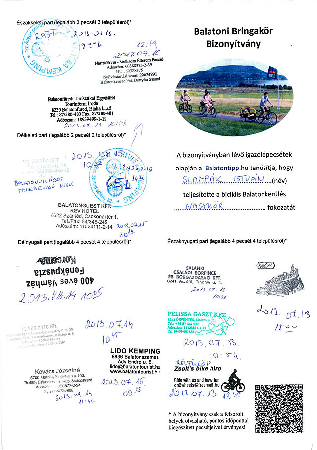 Slampák István (Oroszlány) Slampák Bence (Oroszlány), Osbáth Helga (Almásfüzítő) bizonyítványa a Balatoni Bringakörút teljes szakaszának – Nagykör – végigbiciklizéséről – 2013.07.13-16.